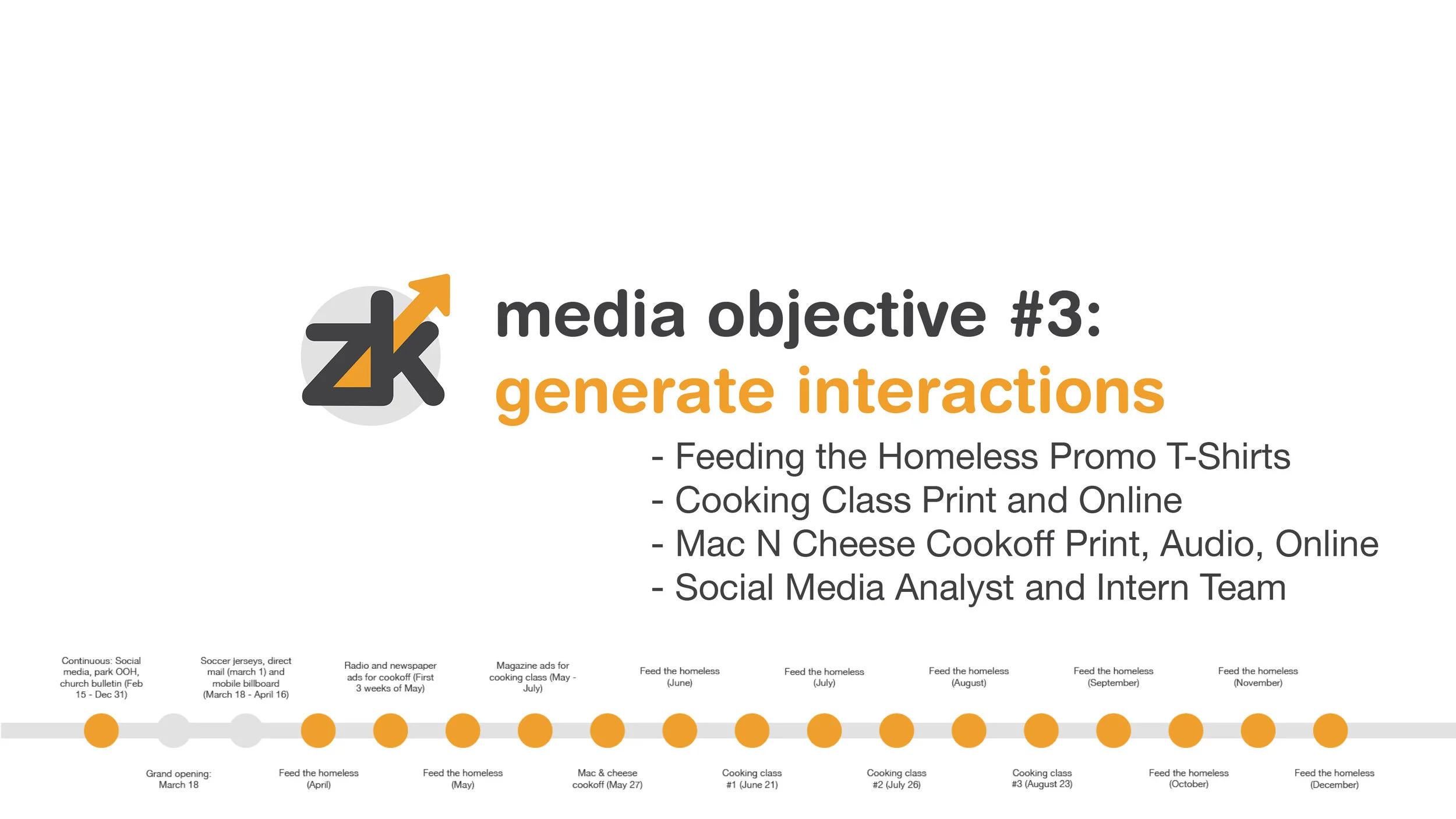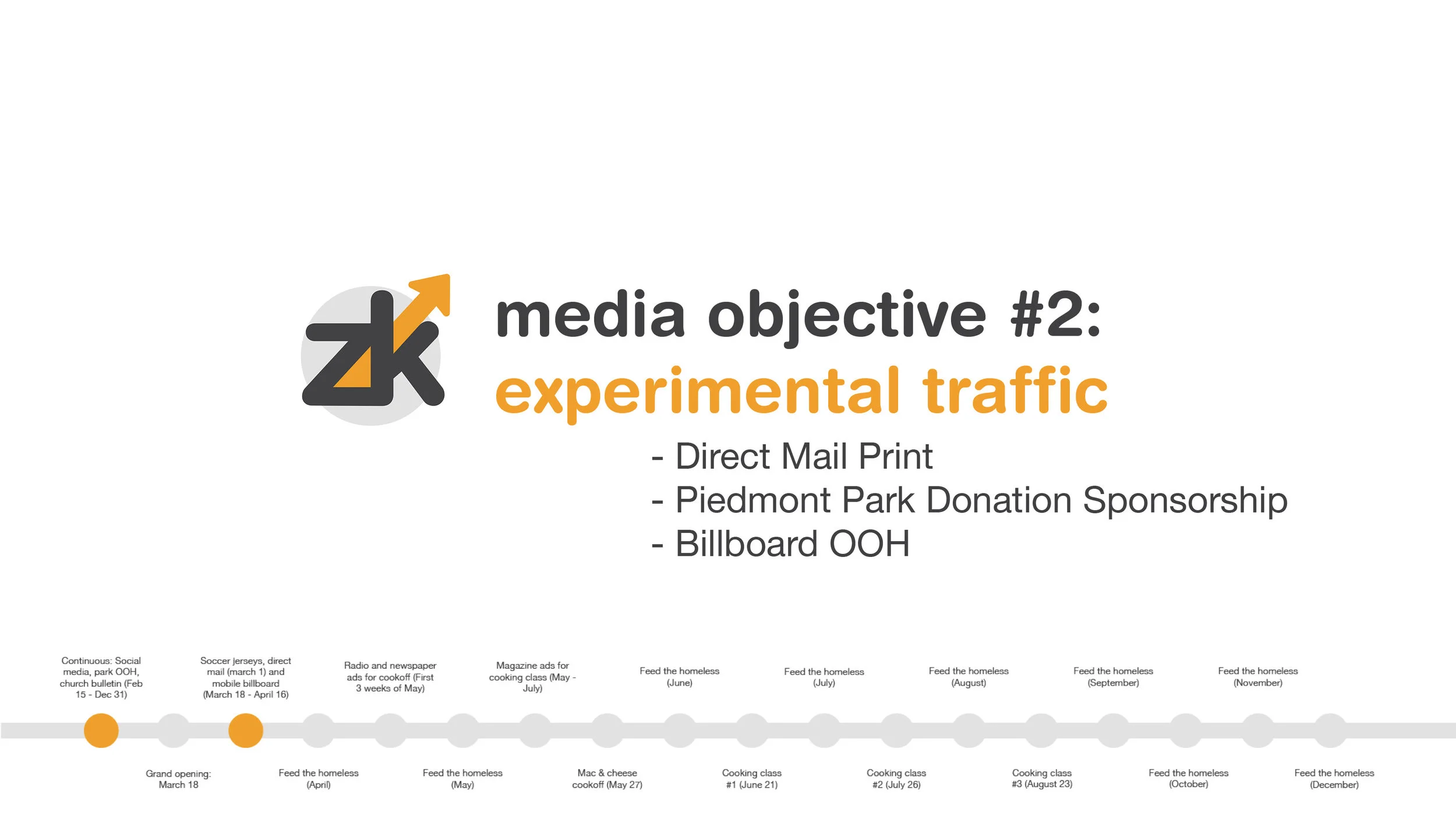Through showcasing the Southern comfort, home-style feeling of Hoover’s, ZK Digital can employ these strategies to reach Hoover’s goals of 375 visitors a day during the week - broken down into 150 for lunch, 100 for Hoover Hour, and 125 for dinner - and 500 visitors a day during the weekends - with 200 for breakfast, 100 for lunch, and 200 for dinner - within twelve weeks of opening their new Atlanta location. Keeping about a 10 mile radius from Hoover’s location at Peachtree Street and 4th Street, the goal is to have at least 20% of our target market brand aware within twelve weeks of launch as a checkpoint. Then through maintenance of social media, print ads, sponsorship, and television commercial spots, ZK Digital will have 50% of the target market well aware of the Hoover’s brand, with at least half of the market familiar with the attitudes, values, beliefs, and location of Hoover’s in Atlanta. Hoover’s launch will take place in mid-Spring of 2017, in March, with pre-launch campaign happening as early as February. Continued marketing efforts will lead throughout the summer months, marking the twelve week period to reach our initial goals.