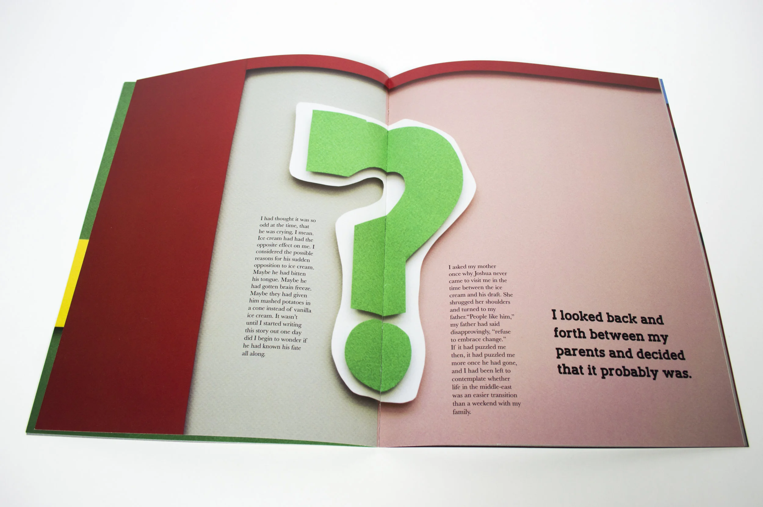 llustrating this story started with a desire to visualize a child’s voice and an adult’s subject matter, which brought me to primary colors and construction paper. This style was adapted to fuse those two components together in a way that was different and visually appealing.